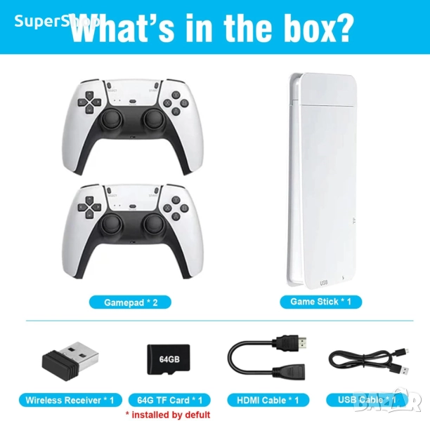 Поддържа 9 игрови симулатора: MAME/FC/GB/GBA/GBC/MD/SFC/PS1 - Playstation 1/ATARI2600/ATARI7800. А двата безжични джойстика в комплекта са черешката на тортата. Гладки линии, опростен и красив дизайн, plug and play, безжични джойстици, с обхват на управление до 8 метра. В сравнение с кабелните джойстици с къси кабели, безжичните избягват приближаването до телевизора и предпазват очите ви по-ефективно. HD изход: Поддържа 4k телевизионен видео сигнал с висока разделителна способност (1080p / 720p) и монитори и с HDMI вход.