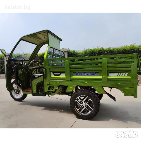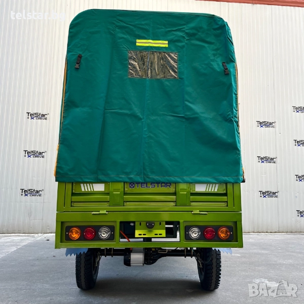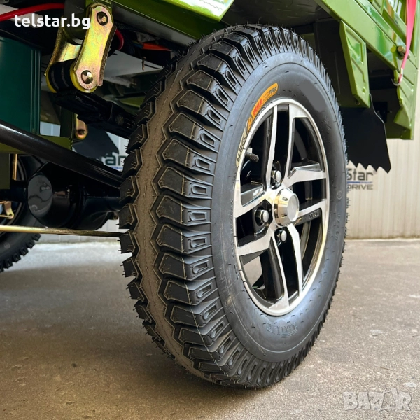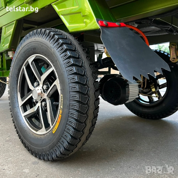 -задно предаване, с голям диференциал, подсилено предно окачване, големи балонни OFFROAD гуми за неравни терени с алуминиеви джанти, многолистови задни ресьори, клаксон, голям светлодиоден LED фарове с ЛУПА, предна подсилена амортисьорна вилка, дигитален LCD дисплей показващ скорост, заряд и волтаж на батерията, пробег, светлини, пълна светлинна окомплектовка- преден фар, гарбарит, стопове, предни /задни мигачи странични светлоотразители тристранни канати за по- лесно товарене и разтоварване, висок клирънс, аларма и светлинна сигнализация ъгъл на изкачване- 25° спирачна система- кормилна спирачка, крачна спирачка и ръчна спирачка за паркиране, външни размери на карго платформата:широчина 110см дължина 160см, цена за сглобяване 140лв