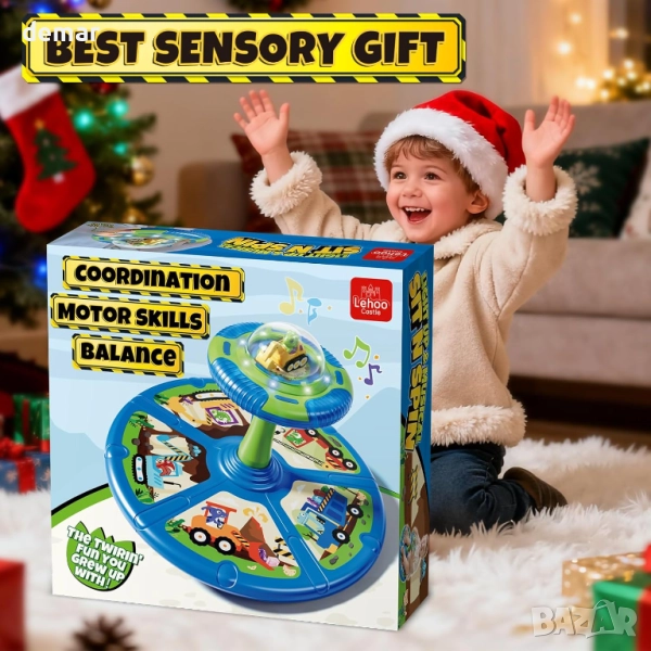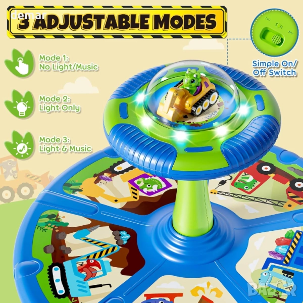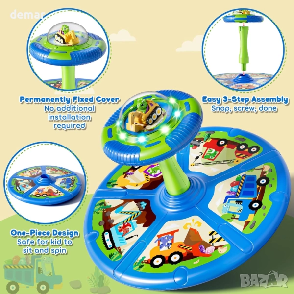 Тази играчка с динозавърска тематика, която се върти и се седи, предлага въображаема активна игра с безопасно въртене на 360°, което подпомага развитието на двигателните умения, баланса и координацията. Включва опционални LED светлини, весела музика и светещ ефект за мултисензорно преживяване. Децата могат да контролират собствената си скорост и посока, което я прави особено полезна за сензорното обучение, включително за деца от аутистичния спектър. Изработена със здрав, безопасен за деца дизайн, неплъзгаща се дръжка и широка седалка, която може да побере до две деца, тя е лесна за сглобяване и подходяща за игра на закрито или на открито. Тя е и чудесен подарък за малки фенове на динозаври и камиони.