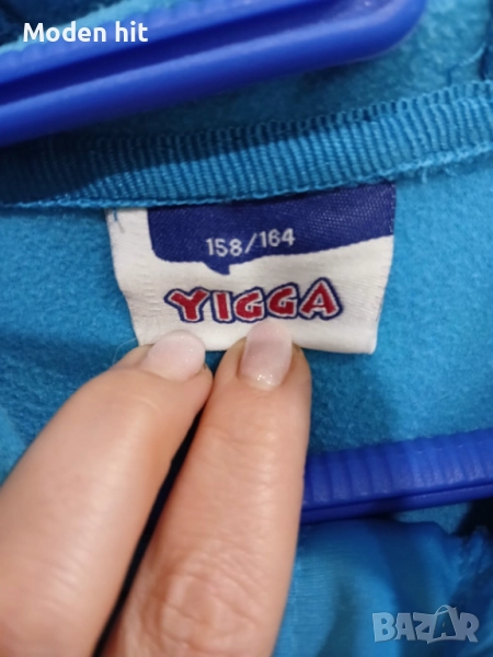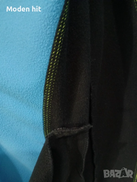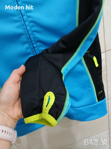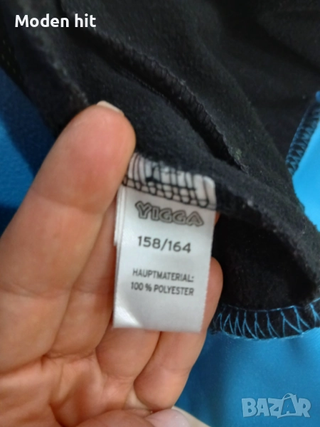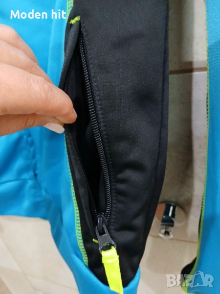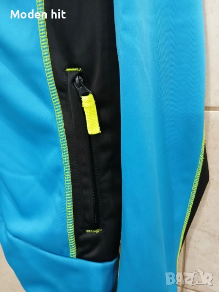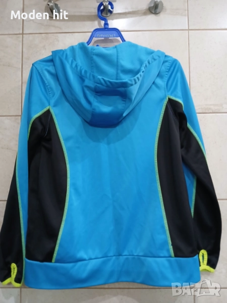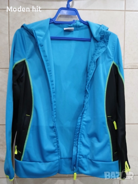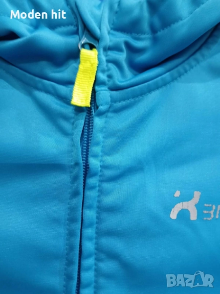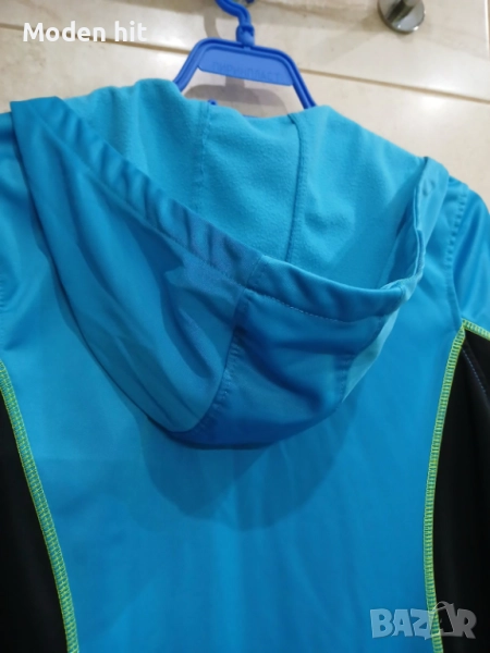 Син с качулка. 100% полиестер. Единствената забележка е поизтритият надпис. Материята е в отлично състояние. От вътре е с лек полар. Непромокаем, с качулка. С два странични джоба с ципове.