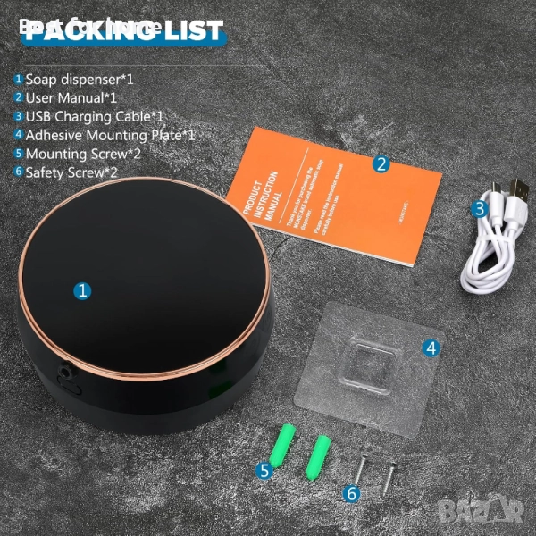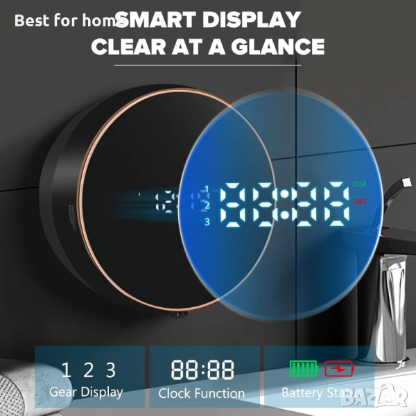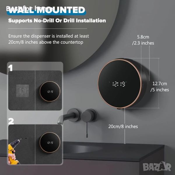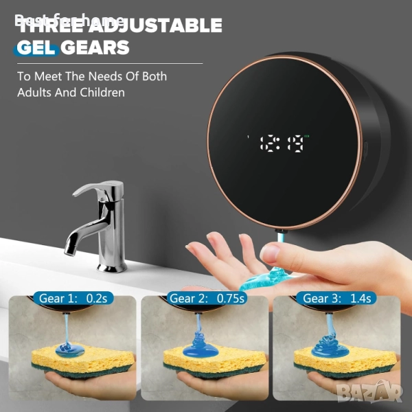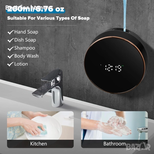 дозатор за течен сапун за баня: Стенен, акумулаторен, безконтактен, регулируем, автоматичен, интелигентен, електрически, пластмасов, черен дозатор за сапун с часовник - Кухня - Лосион за ръце, съдове, двойка, деца.