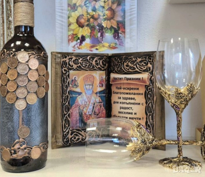 Композицията е допълнена от ръчно изработена книга - икона Св. Николай Чудотворец – закрилник на рибари, мореплаватели и всички, които носят морето в сърцето си. Същата може да е с пожелание за юбилей или с универсално пожелание Честит празник.