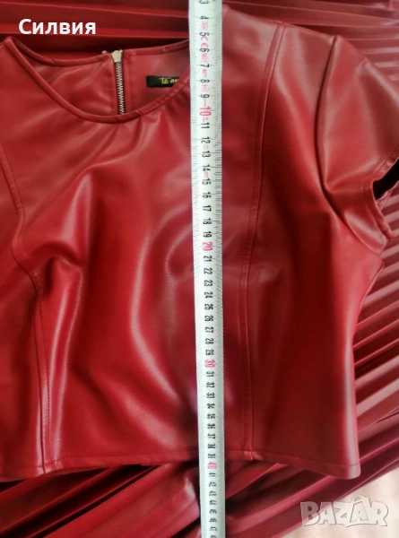 Червен кожен комплект костюм пола и блуза "Te amo" / "Те амо" размер L → Обява 52414023