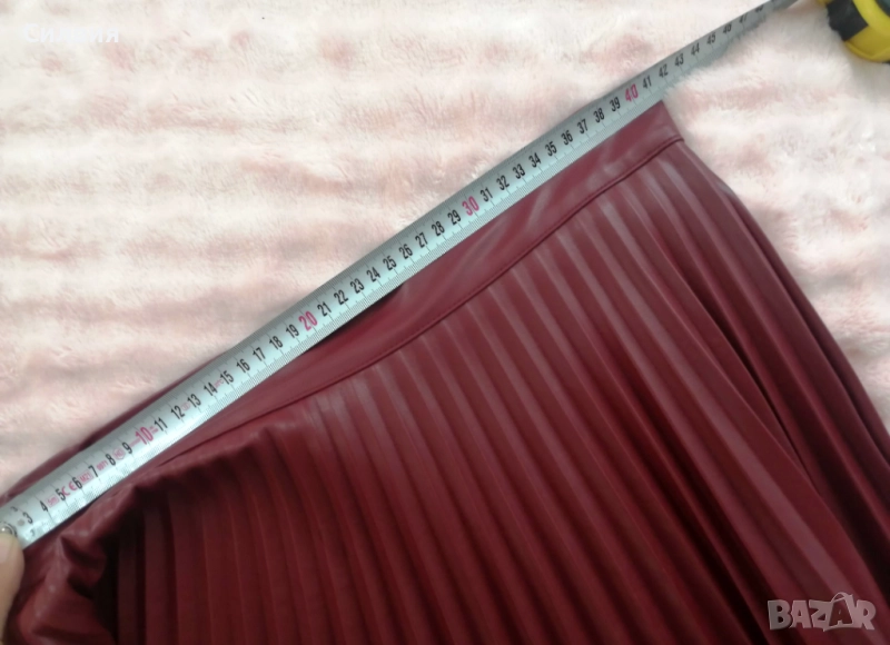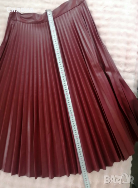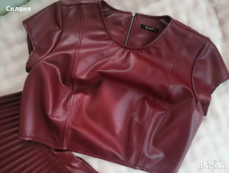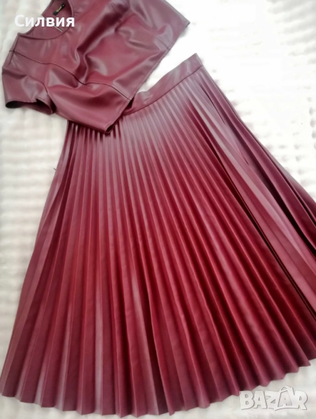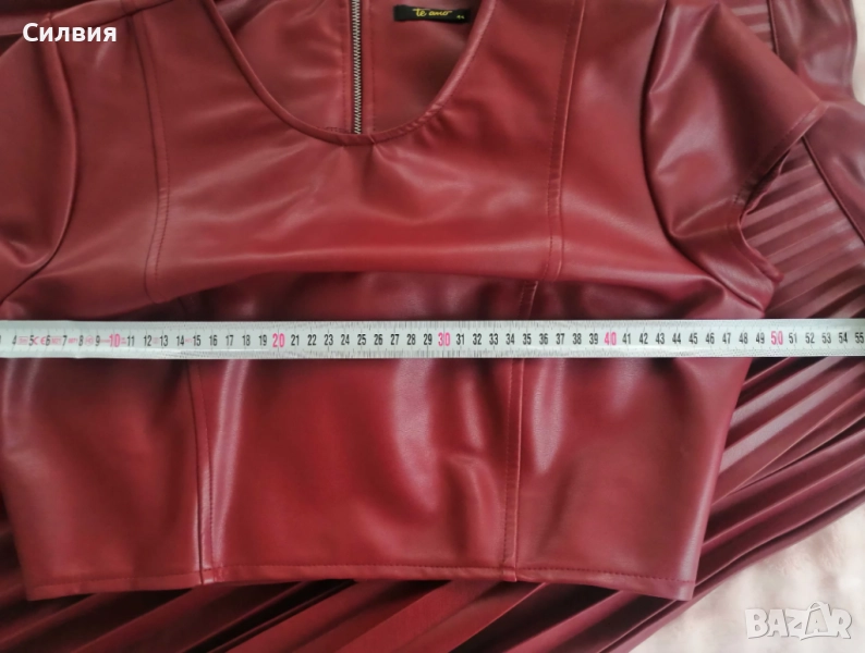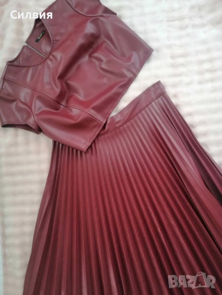 Продавам чисто нов червен кожен комплект (костюм) от дълга кожена плисирана пола и блуза на марката "Te amo" / "Те амо". Дрехите са с номер 42 и отговарят на размер "L". Цветът е наситено червено (бордо) и стои много атрактивно и секси. Кройката е страхотна, а кожата е първокласна и изключително приятна на допир. Полата е с едро плисе, стегната е и е много лъскава. Блузката е с къси ръкави, с цип по цялата дължина на гърба и също толкова красива и лъщяща.
