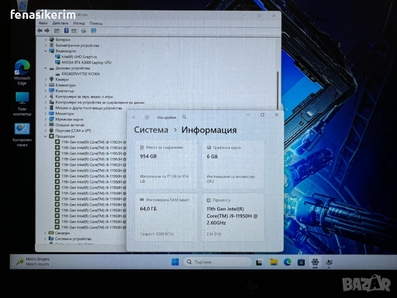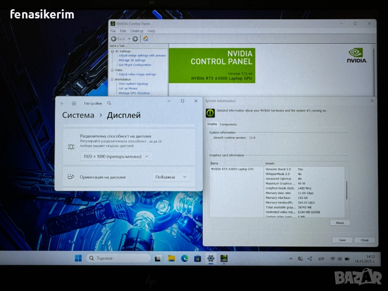 2 видеокарти : Nvidia RTX А3000 192bit 6GB DDR6 собствена памет + Intel UHD Video - up to 24 GB Total Graphics memory.