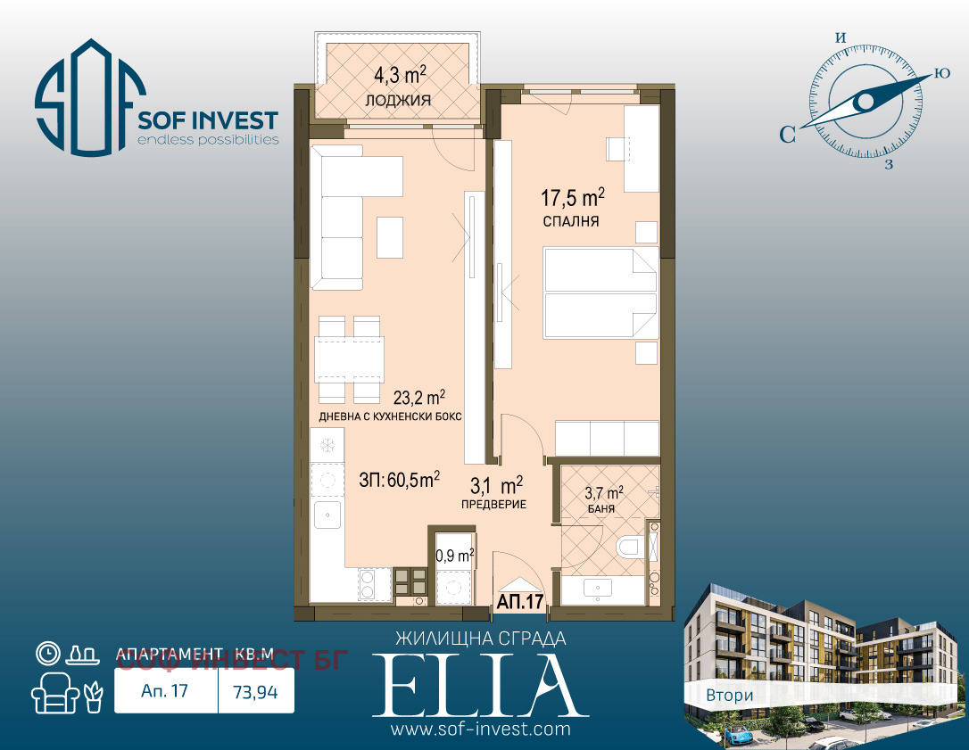 Предлагаме Ви Апартамент 17, разположен на втори етаж, с чиста площ от 60.51 кв.м и обща площ от 73.94 кв.м.