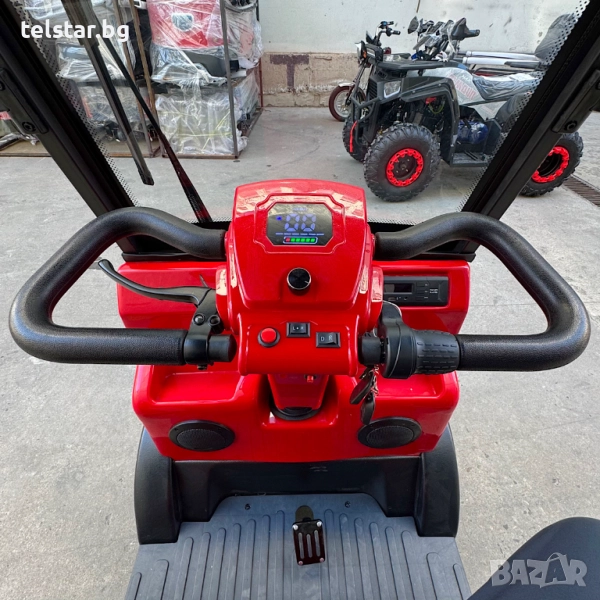 -Удобен волан, задно предаване, с диференциал - брой места: 2 - местна, спирачна система: 1 крачна и 2 ръчни спирачки за по-удобно спиране - павна регулировка на скоростта с потенциометър 5км/ч-45км/ч + задна скорост - аварийни светлини - странични светлоотразители - пълна светлинна окомплектовка ( преден двоен LED фар тип ЛУПА , мигачи- предни, задни, стопове, габарити) - клаксон - Подарък- 2 бр. огледала за задно виждане + 2бр. дистанционни с аларма и безконтактно включване + предна пазарска кошница за пазаруване + ГОЛЯМИ карго отделения зад седалките за багаж