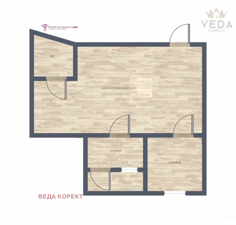 Отворена дневна зона с кухня и трапезария + две самостоятелни спални;