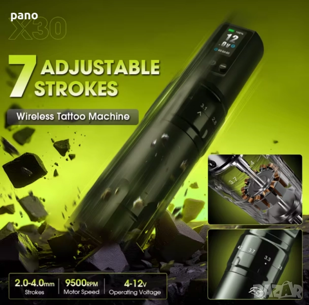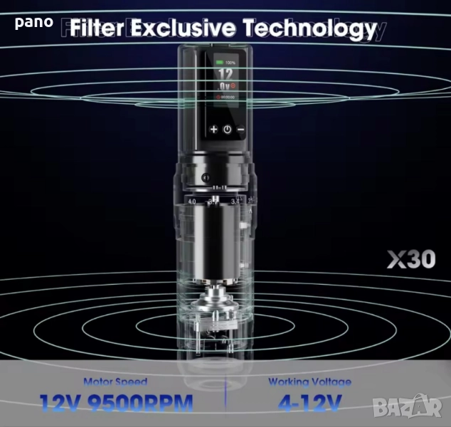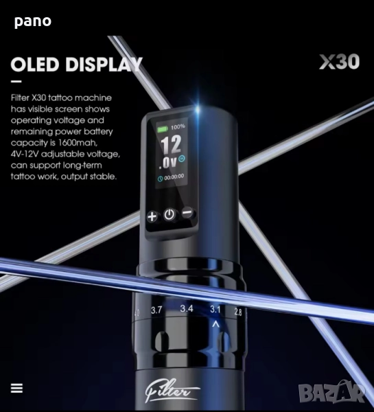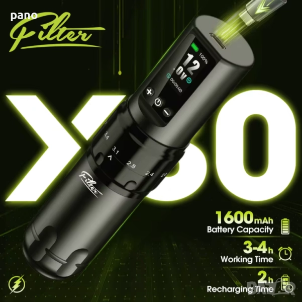 Нова машинка-(145€,с две Батерии) EZ Filter X30 Нов модел, с 2 батерии по1600мАч. Които издържат до 5-6 часа работа всяка. Време за презареждане- 2 часа. 7 регулиращи се строука(от 2.0 до 4.0), която я прави универсална, за изработване на всеки стил от микроблейдинг, СМП, и татуиране във всички стилове. Цветен Олед дисплей, изобразяващ-капацитет на батерия, времетраене, волтаж, джъмп страрт, и плей/пауза. Лесна за употреба с три бутона. Клик система при ръкохватката, и при регулирането на строук. Мощен ъпгрейдван coreless мотор(9500 Rpm.) Регулиране на волтажа от 4 до 12волта. Много тиха и без почти никакви вибрации.Тегло 242гр.дължина 146мм, диаметър36мм. Filter exclusive technology. facebook PANDA tattoo supply