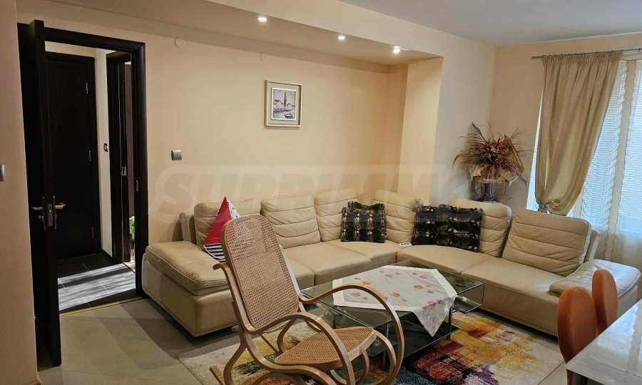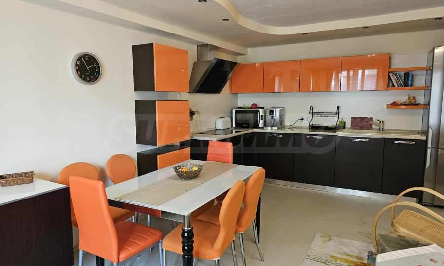 Имотът е напълно обзаведен и оборудван с всичко необходимо за живеене - вградени пералня, сушилня, съдомиялна машина, печка и голям хладилник, 2 бр. ТВ, бойлер и др. Интериорът е решен в светли тонове, със съвременни мебели и техника, а във всички стаи има монтирани климатици.
