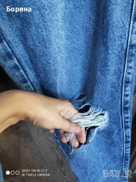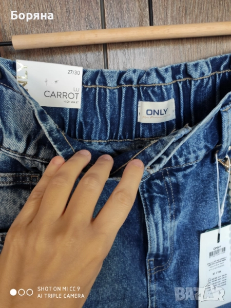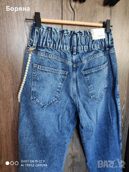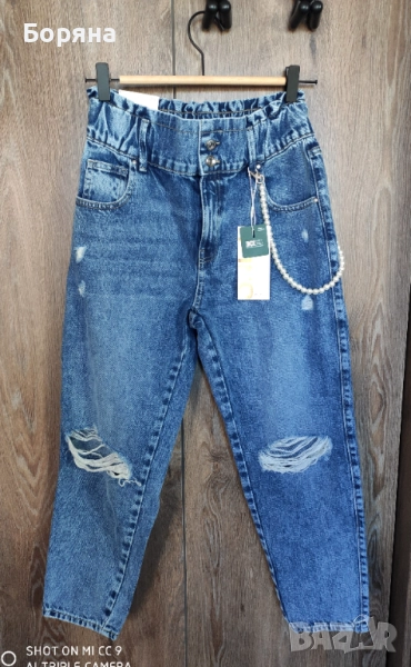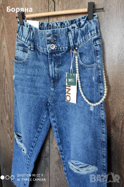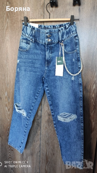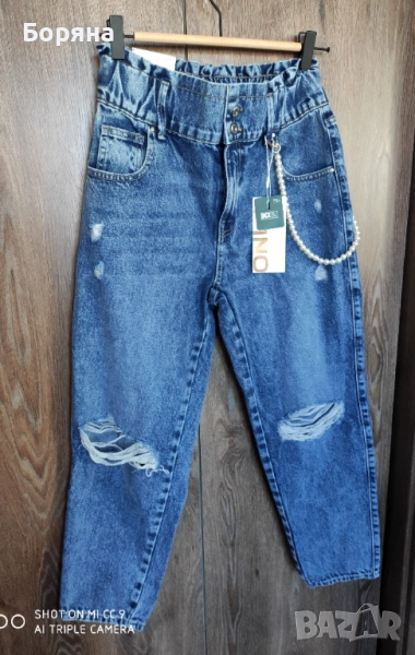 Нови с етикет страхотни дънки на ONLY модел mom-fit с накъсани колене и перлено украшение на единия джоб.