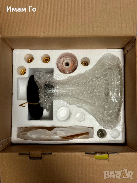 Включени части: тяло, стъклена ваза, маркуч, мундщук, таца, уплътнения, аксесоари (пълен комплект)
