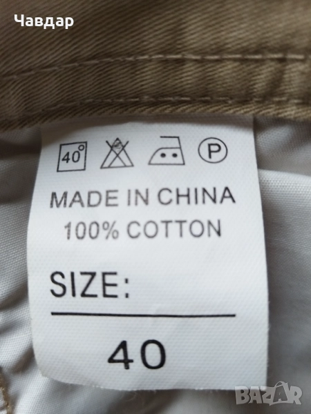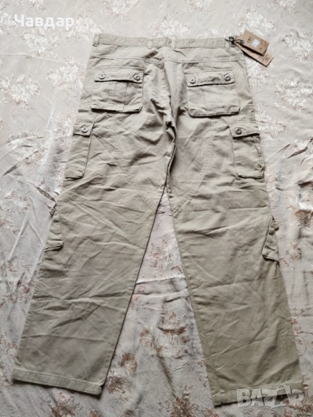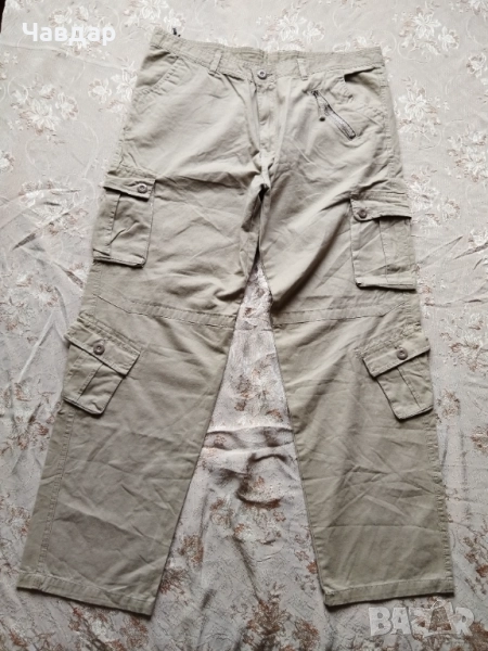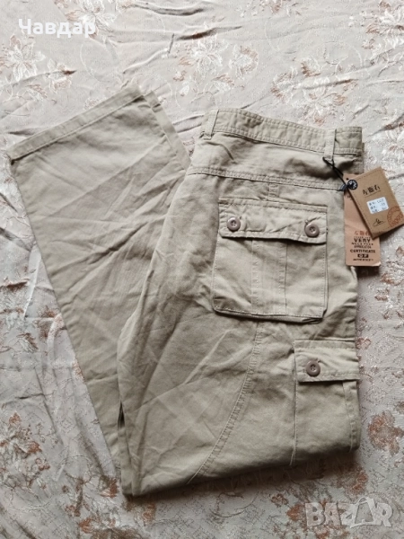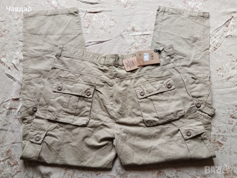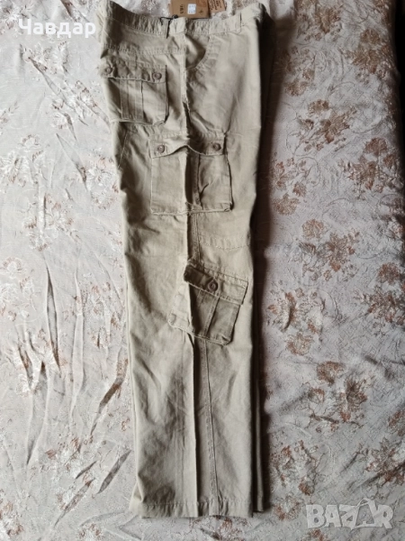 Мъжки карго панталон. Цвят - каки (пясъчно-бежов). 100% памук (масивен, здрав плат). Общо 8 джоба. Подходящ за туризъм и ежедневно ползване. Размер по етикет – 40. Размери: талия – 102 см., крачоли: външна дължина – 112 см., вътрешна – 82 см. Състояние - НОВ с ЕТИКЕТИ. Цена - 20 евро. (не подлежи на коментар).