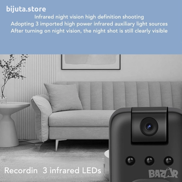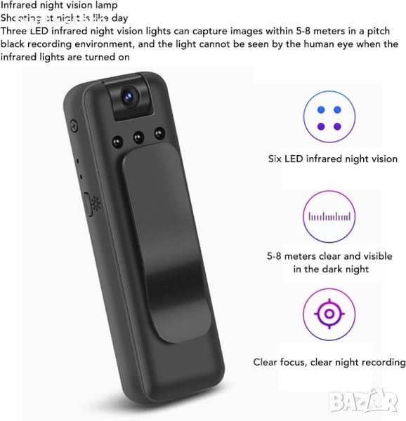 ИНФРАЧЕРВЕНО НОЩНО ВИЖДАНЕ: Мини видеорегистраторът с телесна камера използва три високомощни инфрачервени спомагателни източника на светлина и след включване на нощното виждане, нощното заснемане все още е ясно видимо. СИЛНА МАГНИТНА АДСОРБЦИЯ: Телесната камера е оборудвана с вграден супер силен магнит, който може да се инсталира по всяко време и навсякъде, правейки снимки където пожелаете (не само в ръката ви). Мини преносимата телесна камера е с дизайн с клипс за задна част и се използва широко в екстремни спортове, шофиране, бебешки записи, учебни записи, ежедневни записи.