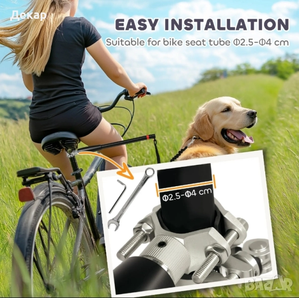 Открийте радостта от колоезденето с вашия четириног приятел, използвайки кучешката каишка PawHut за велосипеди. Тази иновативна кучешка каишка лесно се закрепва към вашия велосипед, като гарантира, че кучето ви ще остане на безопасно разстояние от колелата. Еластичното въже намалява удара от внезапни дърпания, правейки всяко каране плавно и приятно. Подходяща за всички ваши аксесоари за разходка с кучета! Подходяща за диаметър на тръбата на седалката на велосипеда: Φ2.5-Φ4см.