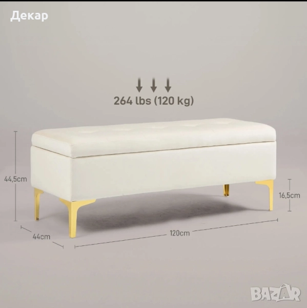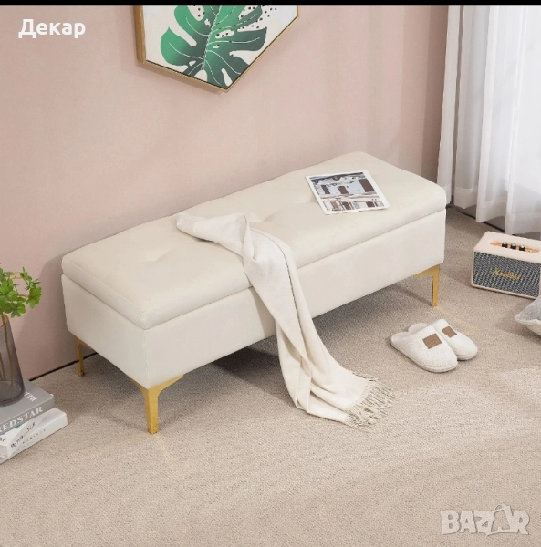 Елегантна пейка с място за съхранение с капитонирани копчета и златисти крака