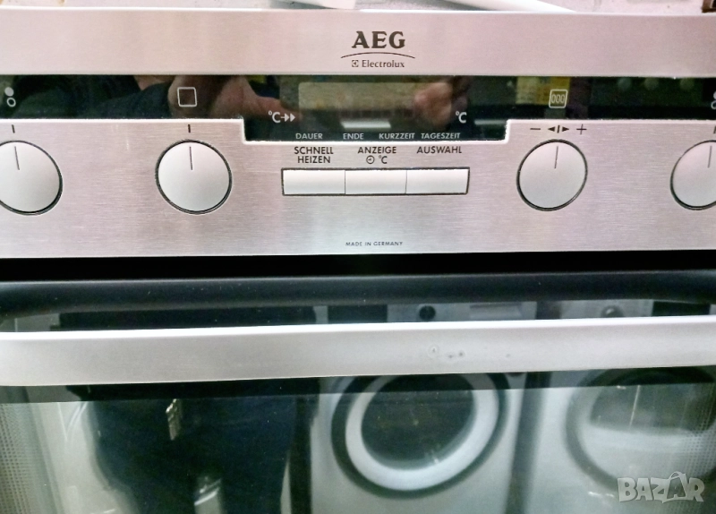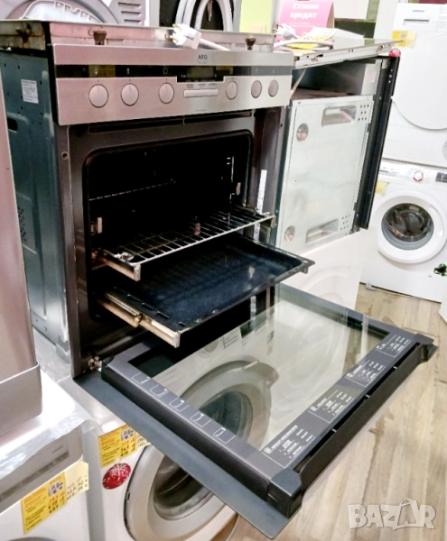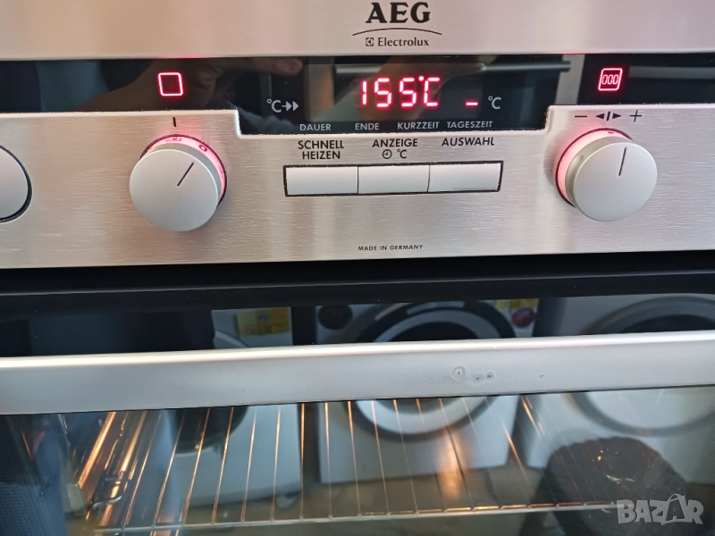 Печка за вграждане AEG , произведена в Германия / цвят - инокс / с пуш бутони и LCD дисплей ( часовник, таймер и др.) / фурната е с вратичка тип студено стъкло и с телескопични водачи. Има 8 функции (грил, вентилатор, конвекция, размразяване, бързо достигане на температурата и др.) / котлоните са с 9 степени / плота е с 4 котлона, индикатори за остатъчна топлина и метален кант.