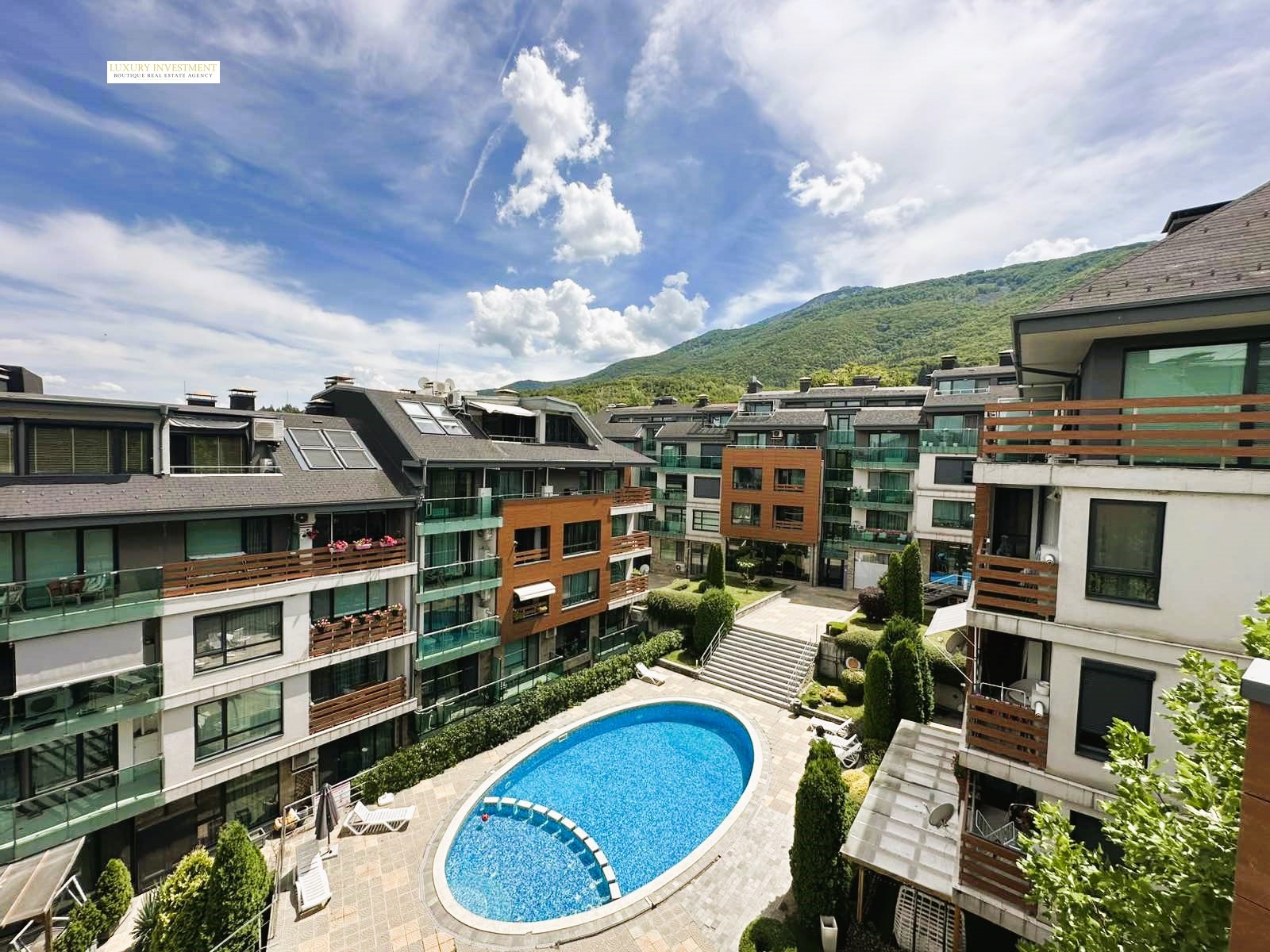 Имотът е ситуиран на четвърти етаж от пететажна сграда и разкрива панорамни гледки към Витоша планина. Апартаментът се предлага на шпакловка и замазка, с поставени интериорни врати. Комплексът разполага с открит басейн, достъпен за всички живущи.