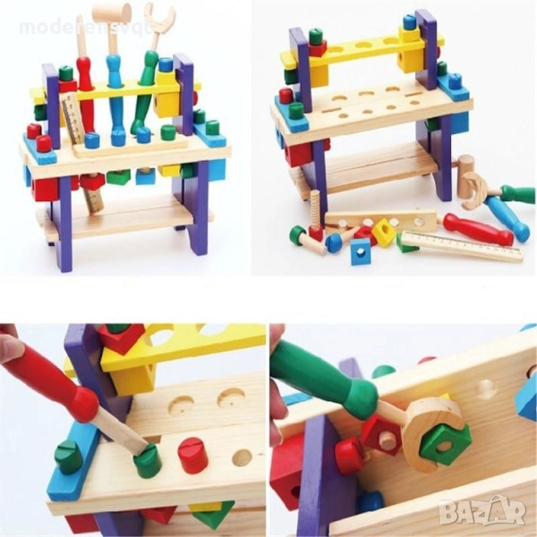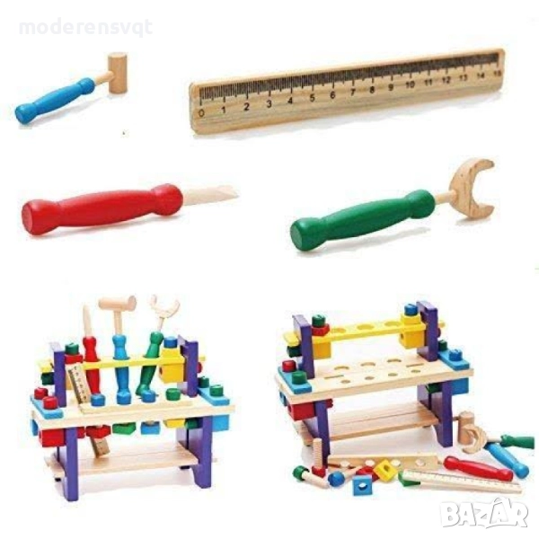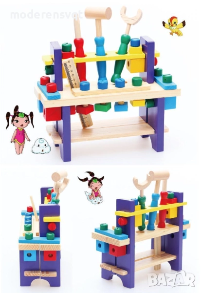 Детската дървена маса с инструменти е малка, но функционална работилница, създадена специално за малките майстори. Тя предлага стабилна маса за работа, място за окачване на инструменти и разнообразни елементи като гайки, чук, гаечен ключ, трион и други, които вдъхновяват детското въображение и насърчават активната игра.