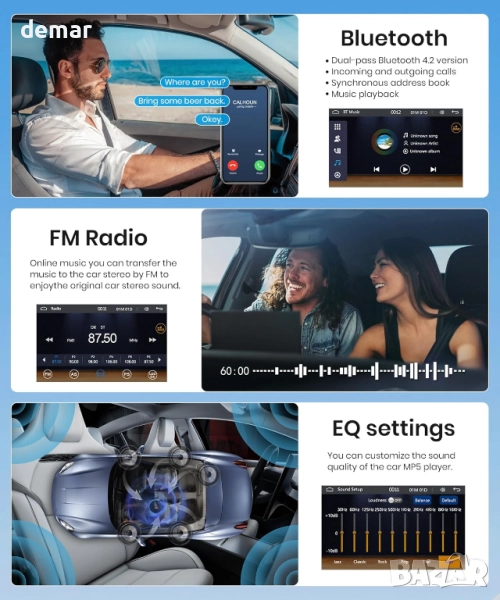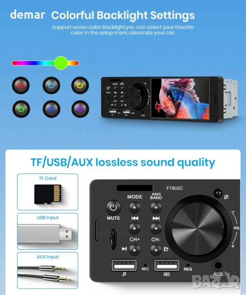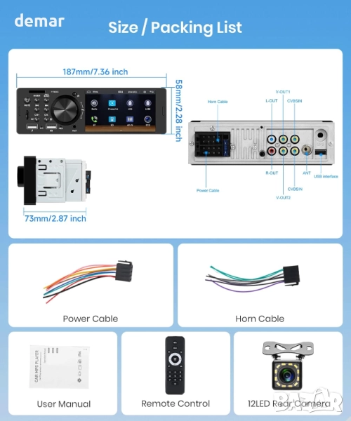 Тази автомобилна стерео система предлага управление със свободни ръце чрез кабелен CarPlay и Android Auto със Siri или Google Assistant, съчетано с компактен 4-инчов HD IPS сензорен дисплей, който остава ясен дори при ярка светлина. Включва два предни USB порта, поддръжка на TF карти и персонализируеми цветове на подсветката, заедно със стабилен Bluetooth 5.1 за плавни разговори и стрийминг на музика, плюс ясно FM/RDS радио. Можете да дублирате екрана на телефона си, да регулирате подробни аудио настройки според вашите предпочитания и да използвате бутоните на волана за по-безопасна работа. Водоустойчива камера за заден ход с нощно виждане се активира автоматично при движение на заден ход, осигурявайки допълнителна видимост и безопасност.