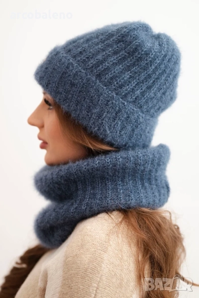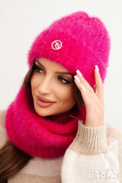 Комплект, състоящ се от шапка и тръбен шал, изработен от пухкава и мека плетена материя с приятна текстура. Материята е еластична и приляга добре около главата и врата, осигурявайки комфорт и топлина в хладните дни.