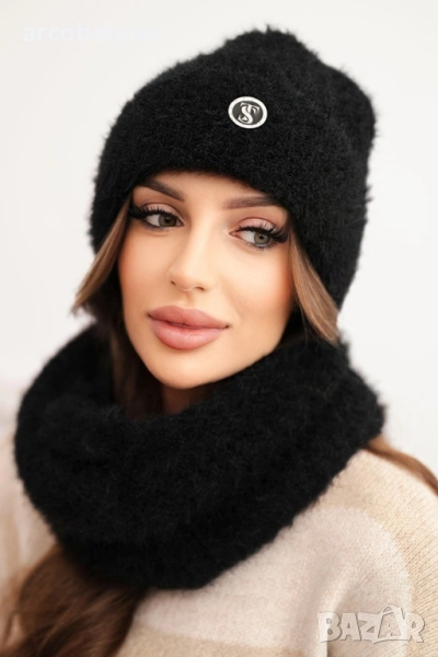 Шапката е с декоративна емблема с метално покритие, което придава на целия комплект модерен и елегантен вид. Шалът е лесен за поставяне през главата, увивайки се около врата без необходимост от връзване.