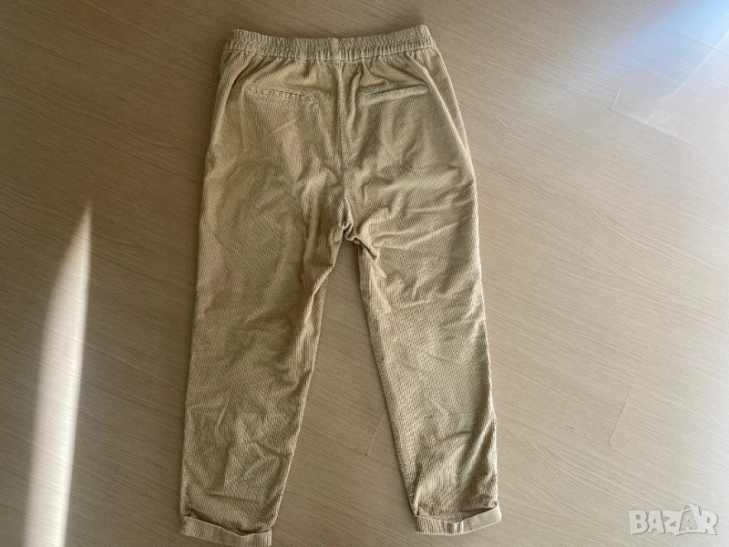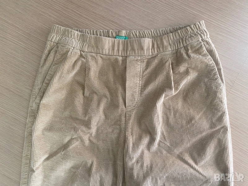 Кадифен чино панталон с еластична висока талия Benetton, цвят бежово, размер М. Панталонът е със свободна кройка от по-плътна материя 98% памук, 2% еластан. Подходящ за есента и зимата. Носен е броени пъти, няма никакви забележки.