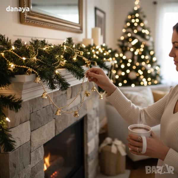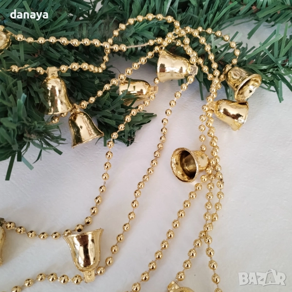 Камбанките са с размер 1.5 cm – малки, фини и ефектни, разположени равномерно по гирлянда. Лъскавият златист завършек създава топъл и празничен акцент, който допълва както традиционната, така и модерната коледна украса.