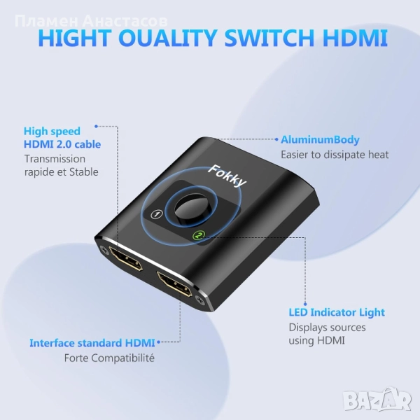 Това устройство от Fokky предлага удобство и гъвкавост: може да превключва между два HDMI източника към един дисплей или да разделя един HDMI сигнал към два монитора. Подходящо за геймъри, домашни кино системи и мултимониторни конфигурации.