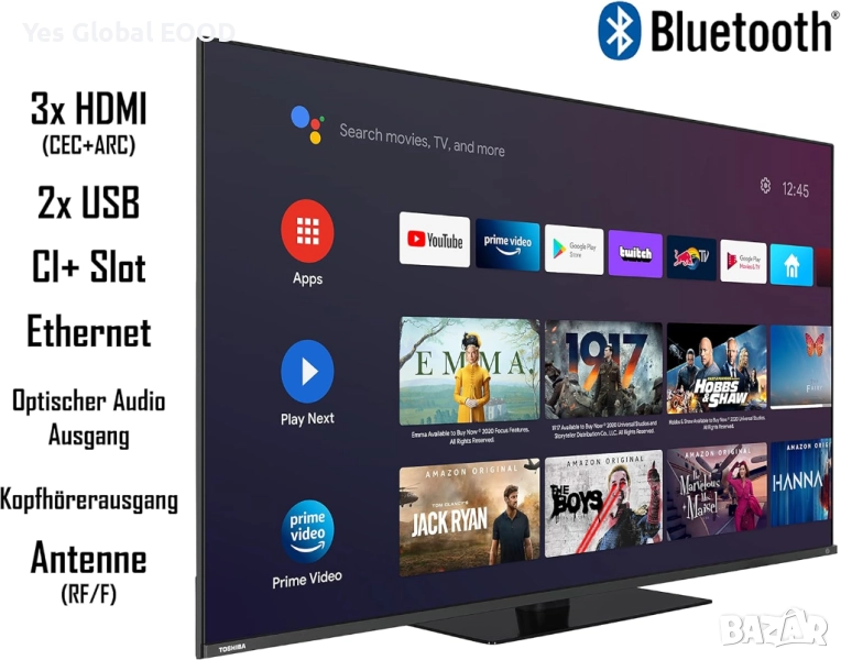 Toshiba 50QA7D63DG е 50-инчов QLED Android телевизор, който предлага ярки цветове, висока контрастност и детайлно 4K Ultra HD качество. Благодарение на HDR и Dolby Vision картината става по-реалистична и динамична, а аудио системата, настроена от Onkyo, осигурява чист и мощен звук. Android TV предоставя достъп до стотици приложения, включително YouTube, Netflix, Prime Video и други. Телевизорът разполага с троен тунер (DVB-T/T2, DVB-C, DVB-S/S2), което позволява директно приемане на ефирни, кабелни и сателитни канали без допълнително устройство.