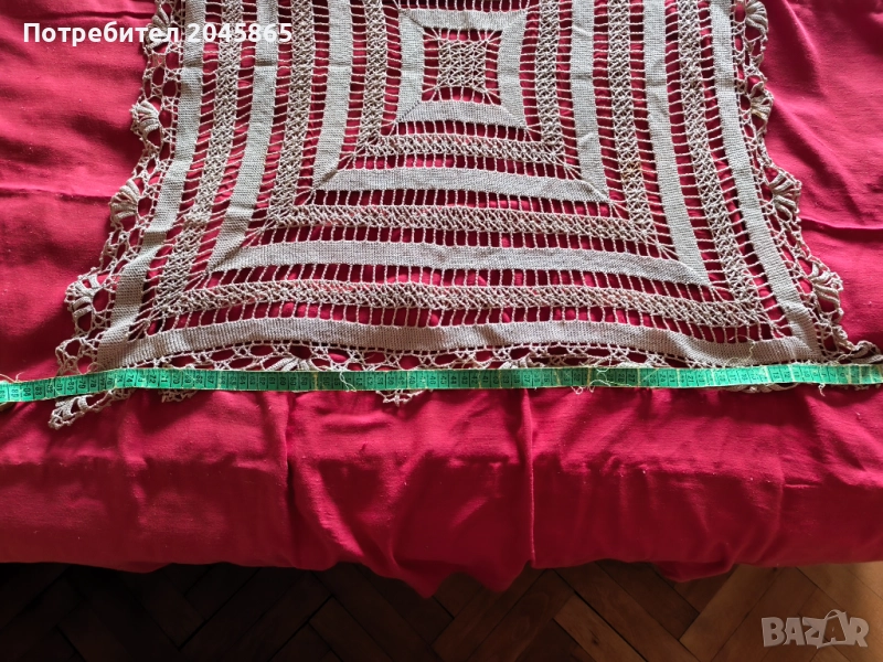 1. Продавам квадратна ръчно изплетена покривка за маса с интересен геометричен десен. Покривката е в добро състояние и може да се използва за украса на вашата трапезария или всекидневна. Размер 85/85 см. Цена 20 лева.