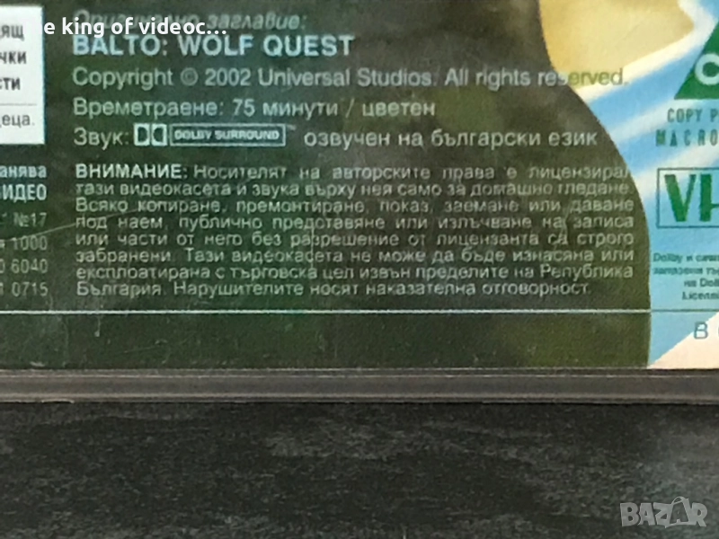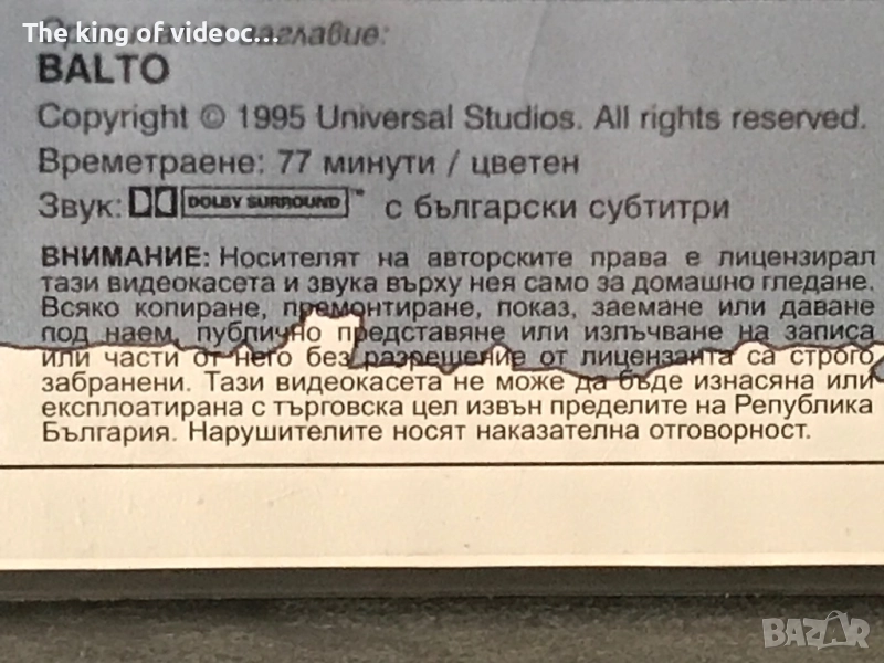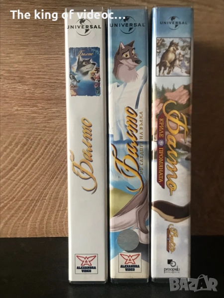 Продавам оригинални видеокасети Балто трилогия. Балто - 1 ( 1995 година ) времетраене 77 минути ( 1ч. и 17 мин.) Балто - 2 По следите на вълка ( 2002 година ) времетраене 75 минути ( 1 ч. 15 мин . ) Балто - 3 Крале на промяната. Създаден 2004 година - пресъздаден на видеокасети 2005 година . Времетраене 76 минути ( 1 час и 16 минути ) И трите касети Балто са с кристално качество и отлична картина и страхотен дублаж . Обложките кутиите и самите касети са много запазени като нови . Видеокасетата Балто 3 - Крале на Промяната е последната серия от поредицата Балто издадена на видеокасета . Видеокасетата Балто 3 се намира изключително трудно , защото към онзи момент 2005 година преустановяват филмите от