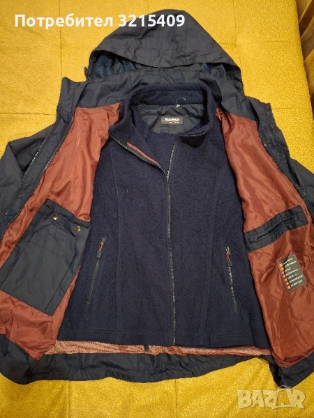 Якето е чисто ново, без етикет. Непромукаемо.синьо, с второ вътрешно поларено яке.От рамо до рамо 50 см,от мишница до мишница 62 см,дължина 68 см.