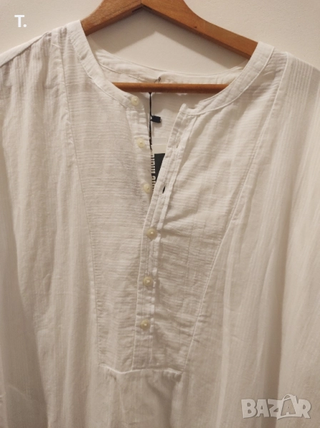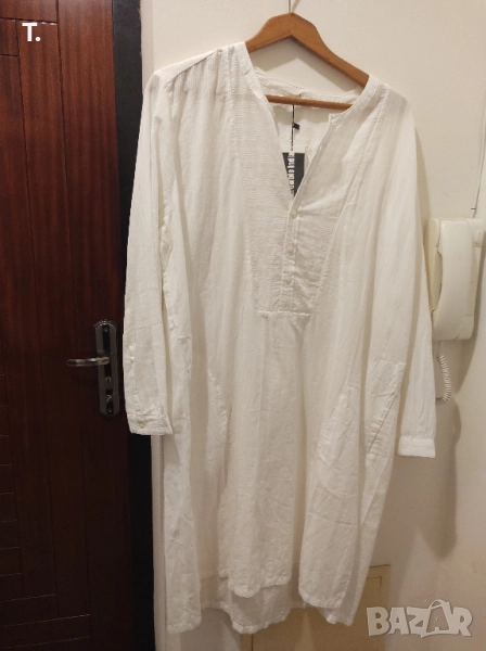 Бяла памучна риза, много приятна на допир. Дълга е и може да се ползва и като туника. Изпращам с преглед и тест.