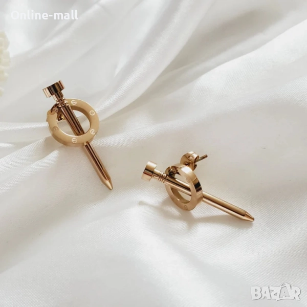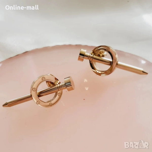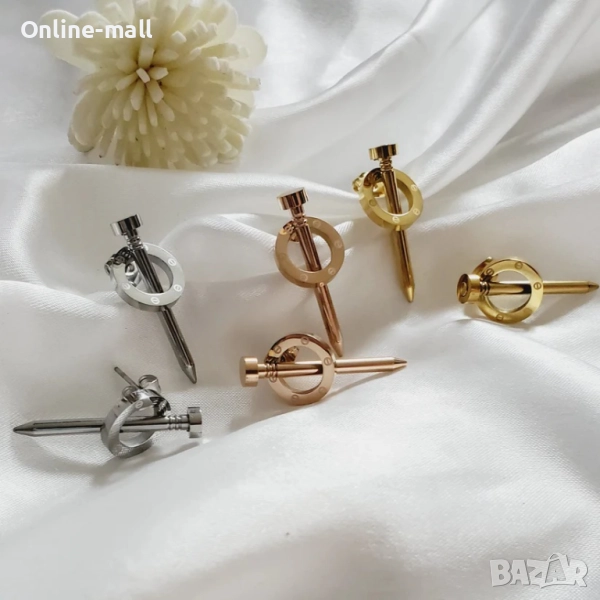 Стилни и модерни обеци тип Пирон, изработени от висококачествена медицинска стомана 316L, която е хипоалергенна, устойчива на износване и не променя цвета си. Моделът впечатлява с изчистена линия и характерен дизайн – метален пирон с декоративен гравиран ринг, вдъхновен от луксозната естетика на високия клас бижута.
