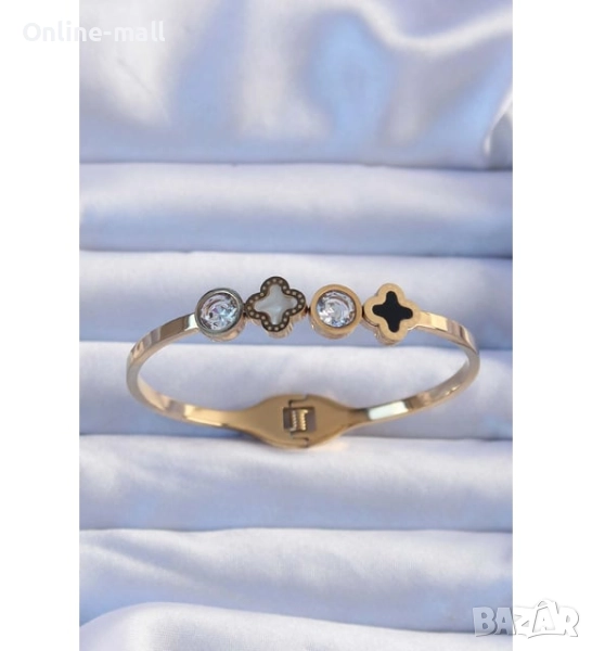 Луксозна гривна с детелини и кристали стил Van Cleef – медицинска стомана, златна → Обява 52424375