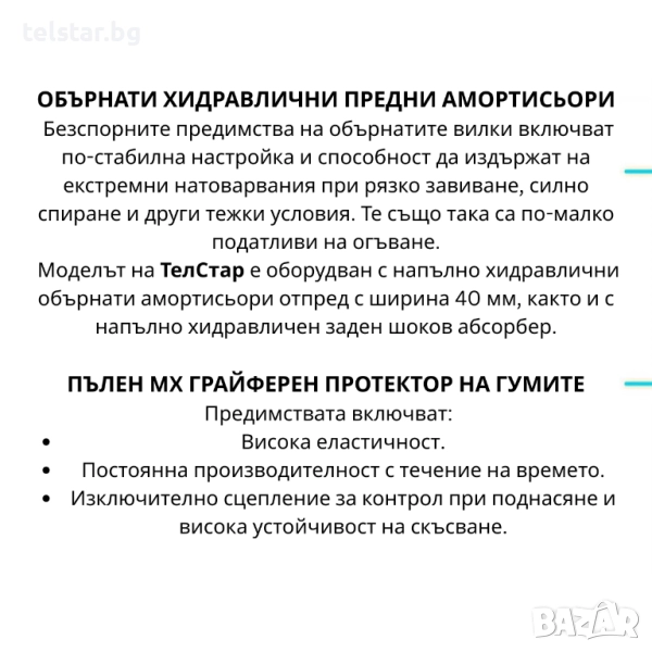 - По-здрава конструкция, по-добър контрол при рязко завиване и спиране. 40мм напълно хидравлични амортисьори отпред и отзад.