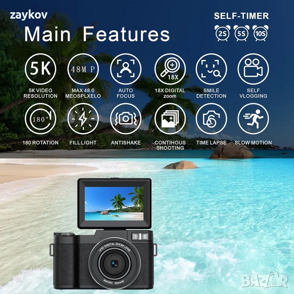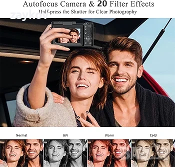Многофункционален цифров фотоапарат „насочи и снимай“: Този 5K цифров фотоапарат има множество функции, включително четири режима за снимки (непрекъснато снимане/таймер/автоматичен режим/нормален режим) и четири видео режима (запис с интервал/цикличен запис/запис на забавен каданс/нормален видео режим), запълваща светлина със светкавица, множество филтри и функция за разкрасяване. Един фотоапарат може да отговори на всички ваши фотографски нужди.