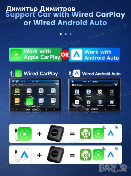 Продавам адаптор за безжичен CarPlay и Android Auto за мултимедията на автомобила.