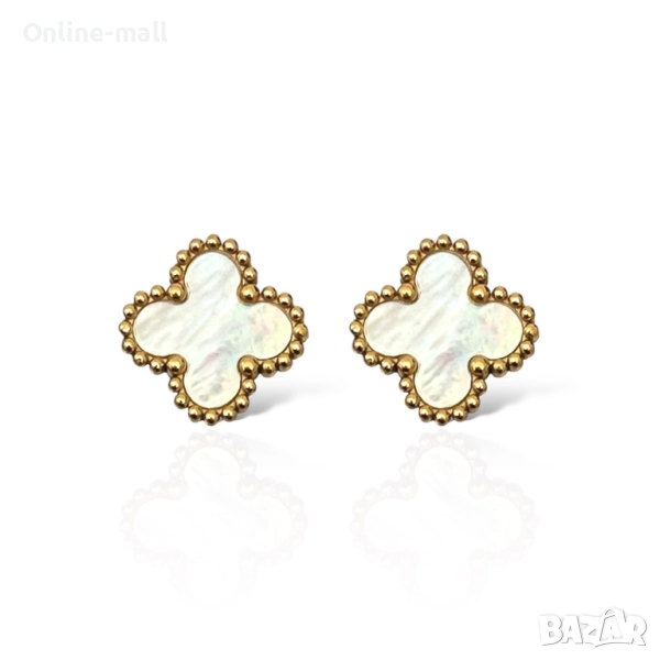 Елегантни обеци бели и черни детелини със златен обков – стил Van Cleef- медицинска стомана