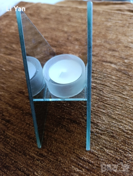 Стъклен свещник за една свещ с ефект за повече свещи.