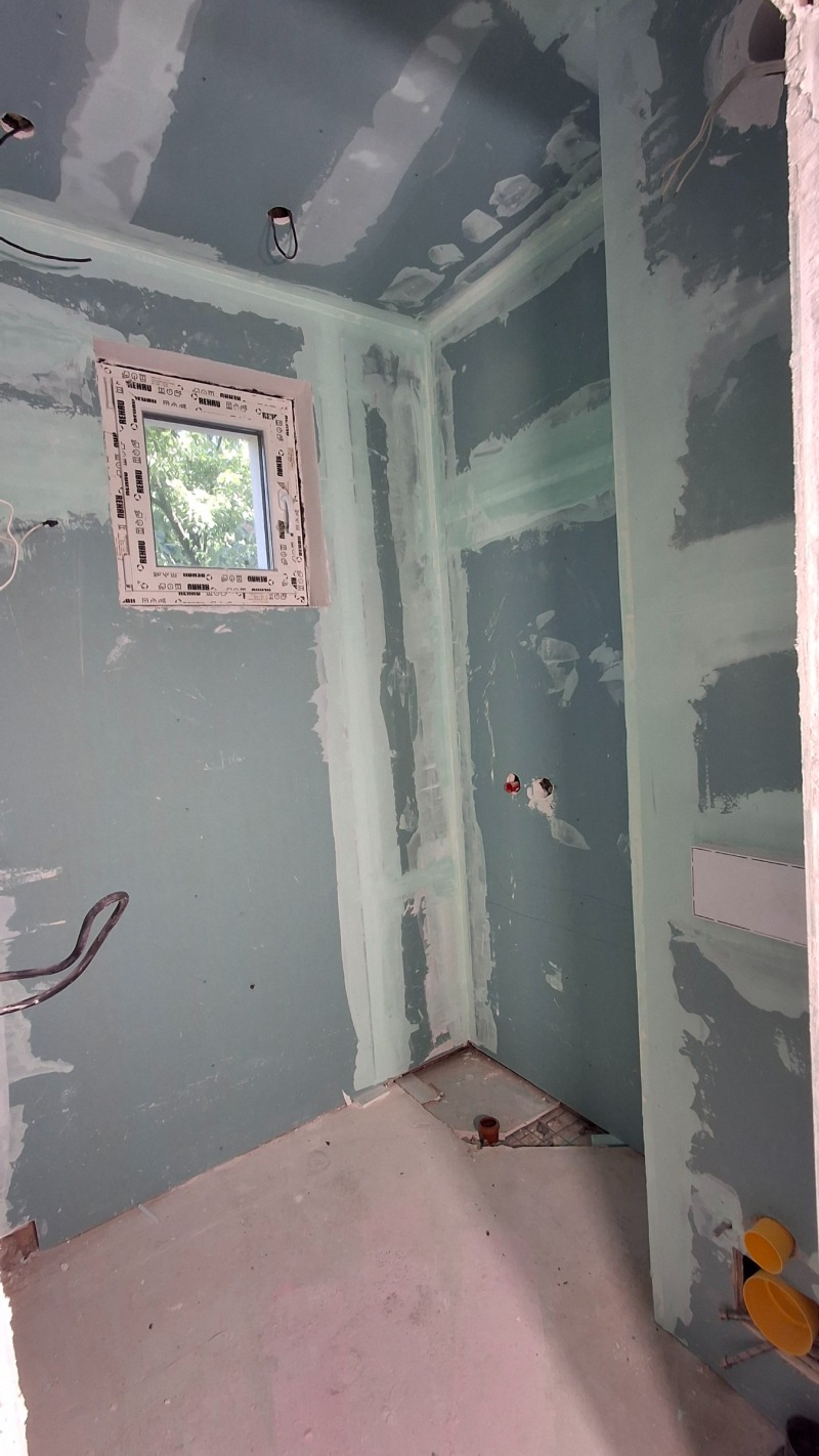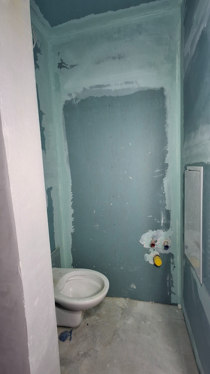 - Баня и тоалетна на гипс картон. Вградени структури в банята и тоалетната. Налични - 2бр. тоалетни чинии с вградени бидета и смесителни кранове върху тоалетните чинии.