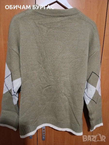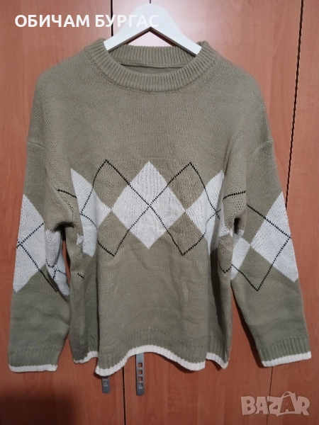 НОВ ПУЛОВЕР ОТ МЕКО ПЛЕТИВО В ЦВЯТ КАКИ С ШАРКА РОМБОВЕ → Обява 52426560