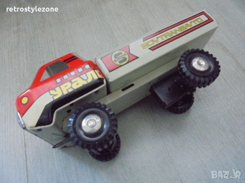 Стар колекционерски съветски ламаринен камион „Урал“, произведен в СССР. Това е оригинална винтидж метална играчка от епохата, изработена от ламарина с характерните за периода ярки графики и цветове.