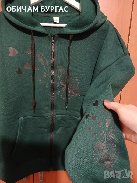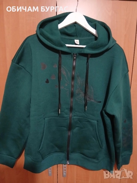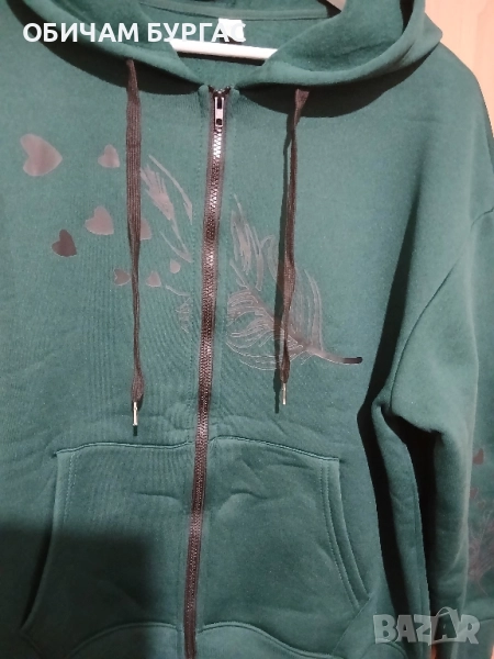 3xl НОВ ТОПЪЛ СУИТШЪР В МАСЛЕНО ЗЕЛЕН ЦВЯТ С ЦИП,КАЧУЛКА И ЩАМПА ОТПРЕД И НА ЛЕВИЯ РЪКАВ → Обява 52426627