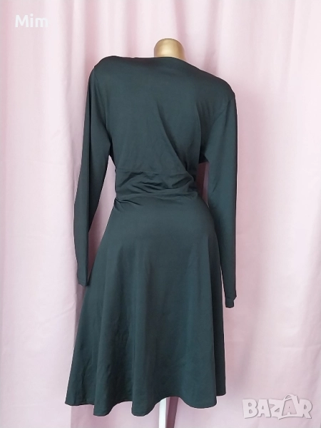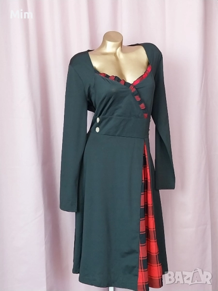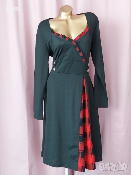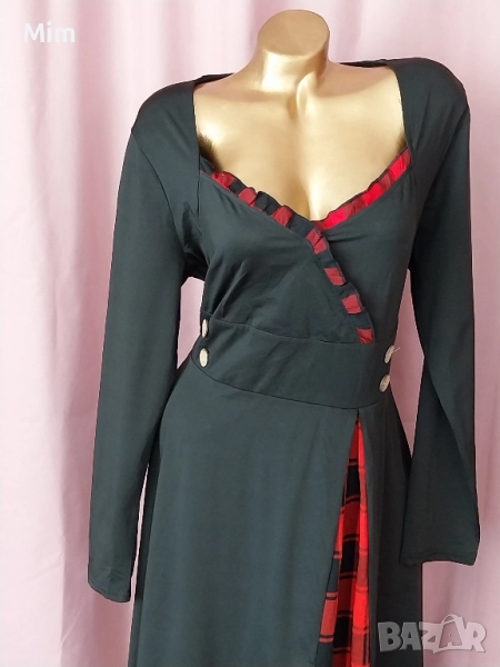 Черна еластична рокля с дълъг ръкав ,гръдна 110 до 130 см еластичност,отпред на бюста е с тип прегърни ме скъд.и червено каре ,талия 100да110 см еластичност, надолу се разширява има плоча с червено каре в талията е с широк колан с 4 копчета, дължина на ръкавите 62 см ,Няма забележки.