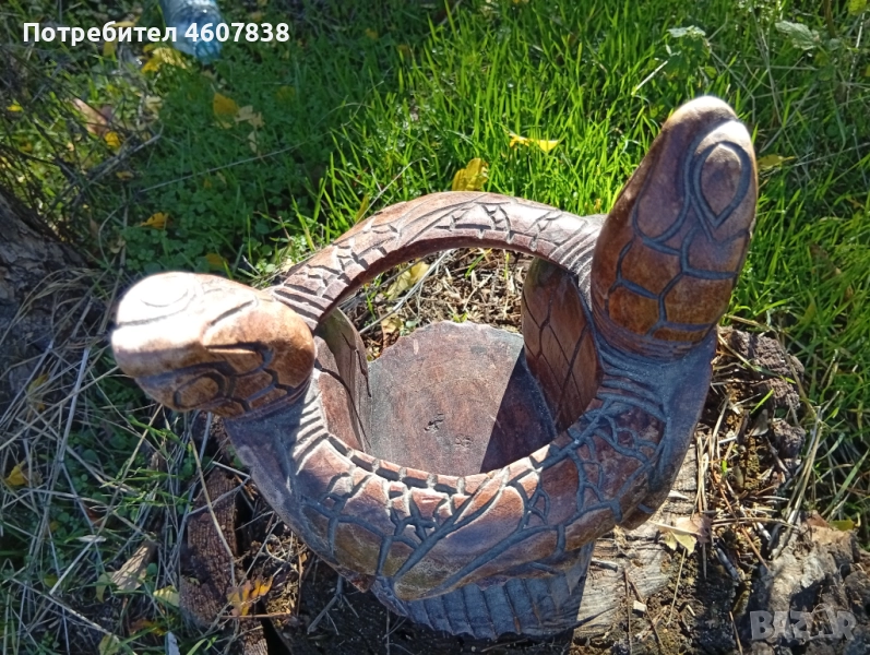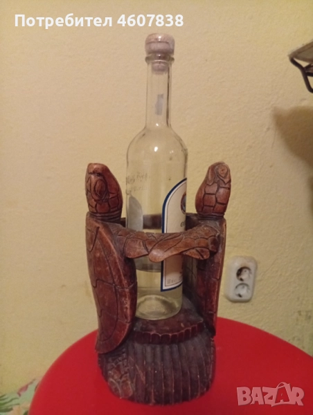Дърворезба скулптура стойка за бутилка алкохол масивна.
