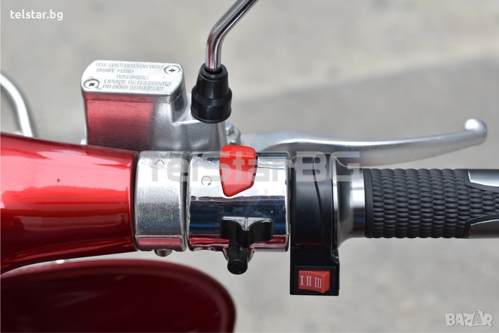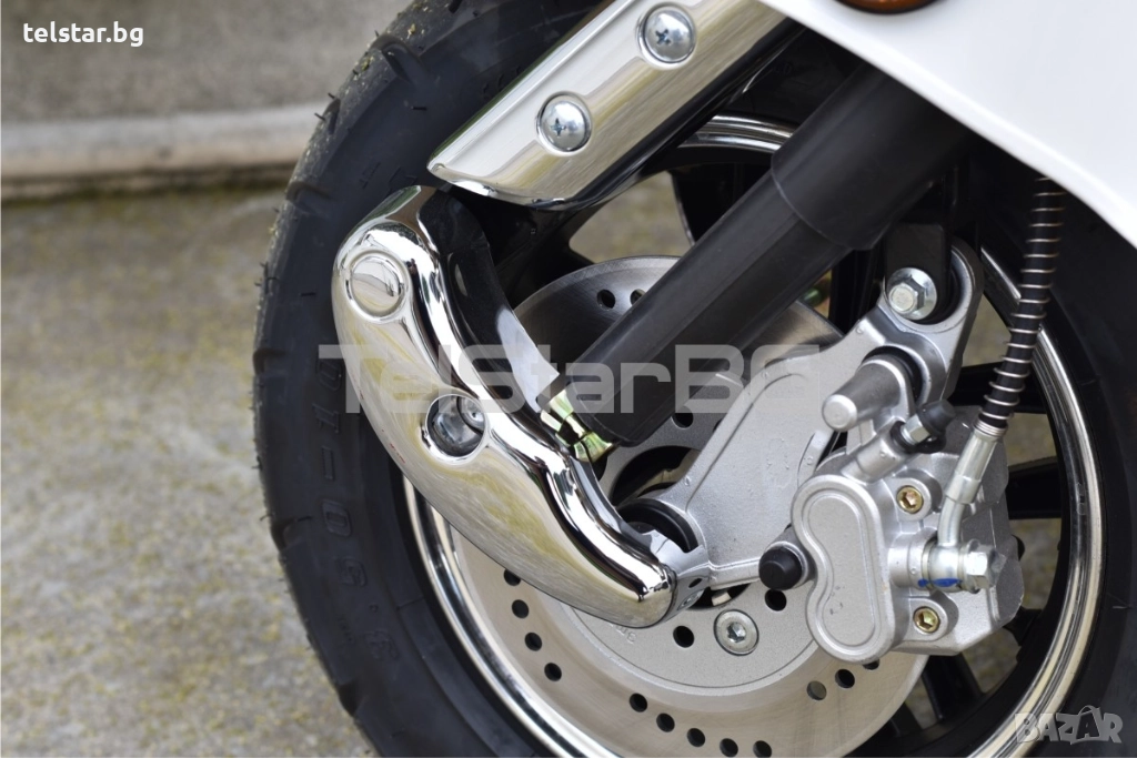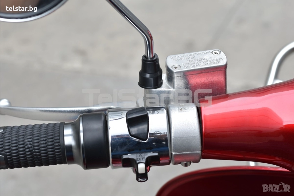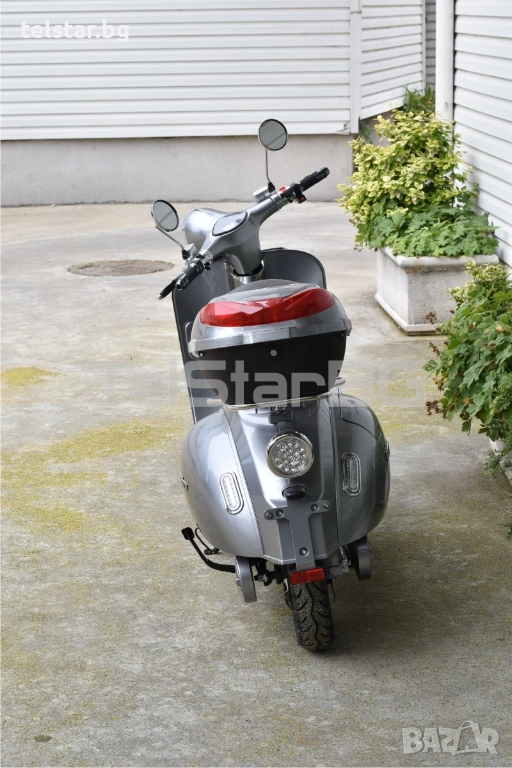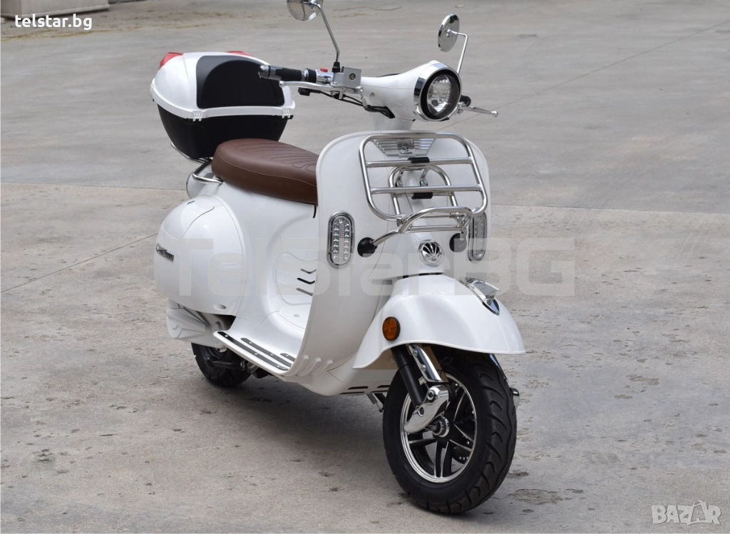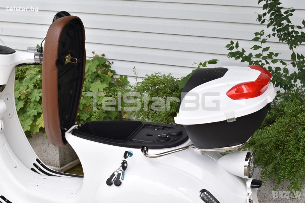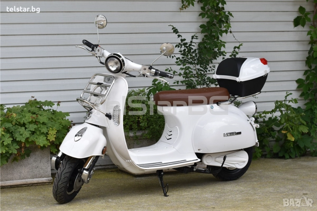 -пълна светлинна окомплектовка- преден фар, заден стоп, предни и задни мигачи, габарити, къси и дълги светлини - светещ дисплей с показания за скорост, ниво на батерия, изминато разстояние, пътепоказатели, светлини и др. - товарен отсек под седалката - аларма/дистанционно управление 2 бр. подарък към ключовете при закупуване - зарядното устройство е включено в комплекта - предни и задни амортисьори - голяма задна кутия за багаж или каска С включени никелирани преден и заден оригинален Веспа метален багажник +190лв Пластмасов куфар + никелирани огледала подарък!Супер мощен, една истинска класика! Със CE сертификат и възможност за регистрация в КАТ. Скутерите са предназначени за немския пазар и се отличават с високо качество на изработка на всеки детайл.