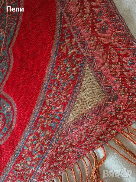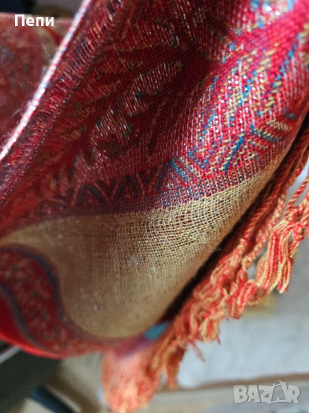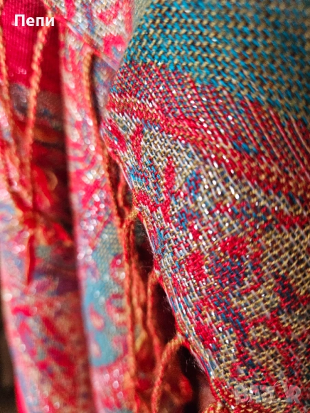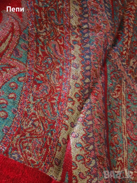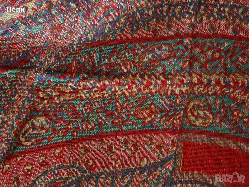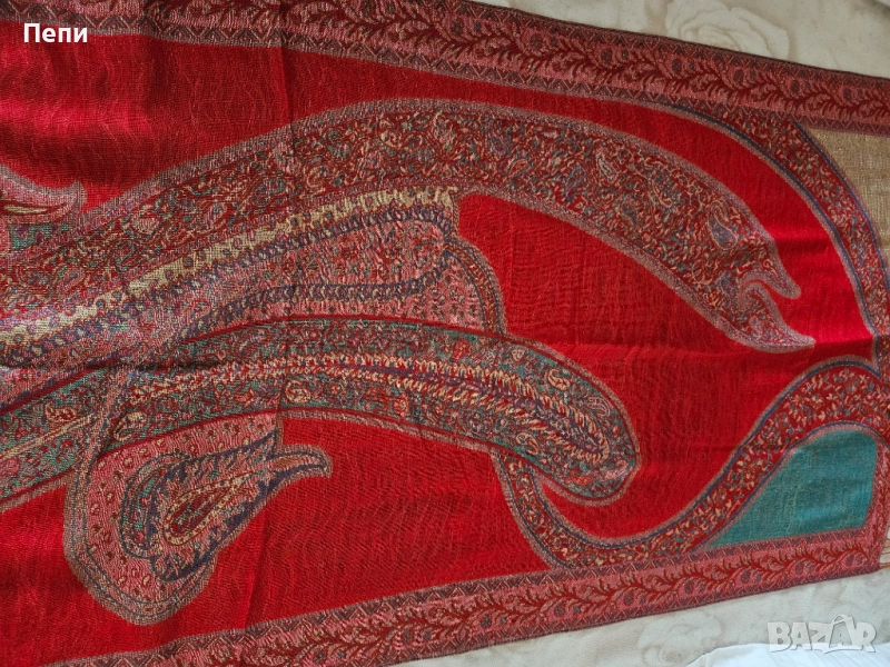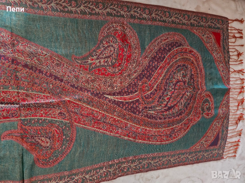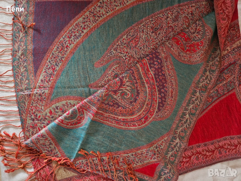 Много ефектен, голям шал, който може да се ползва като наметка. Материал пашмина (кашмир). Целият шал има бляскава нишка в основата, която не успявам да покажа в снимка, колкото и да се опитвах.