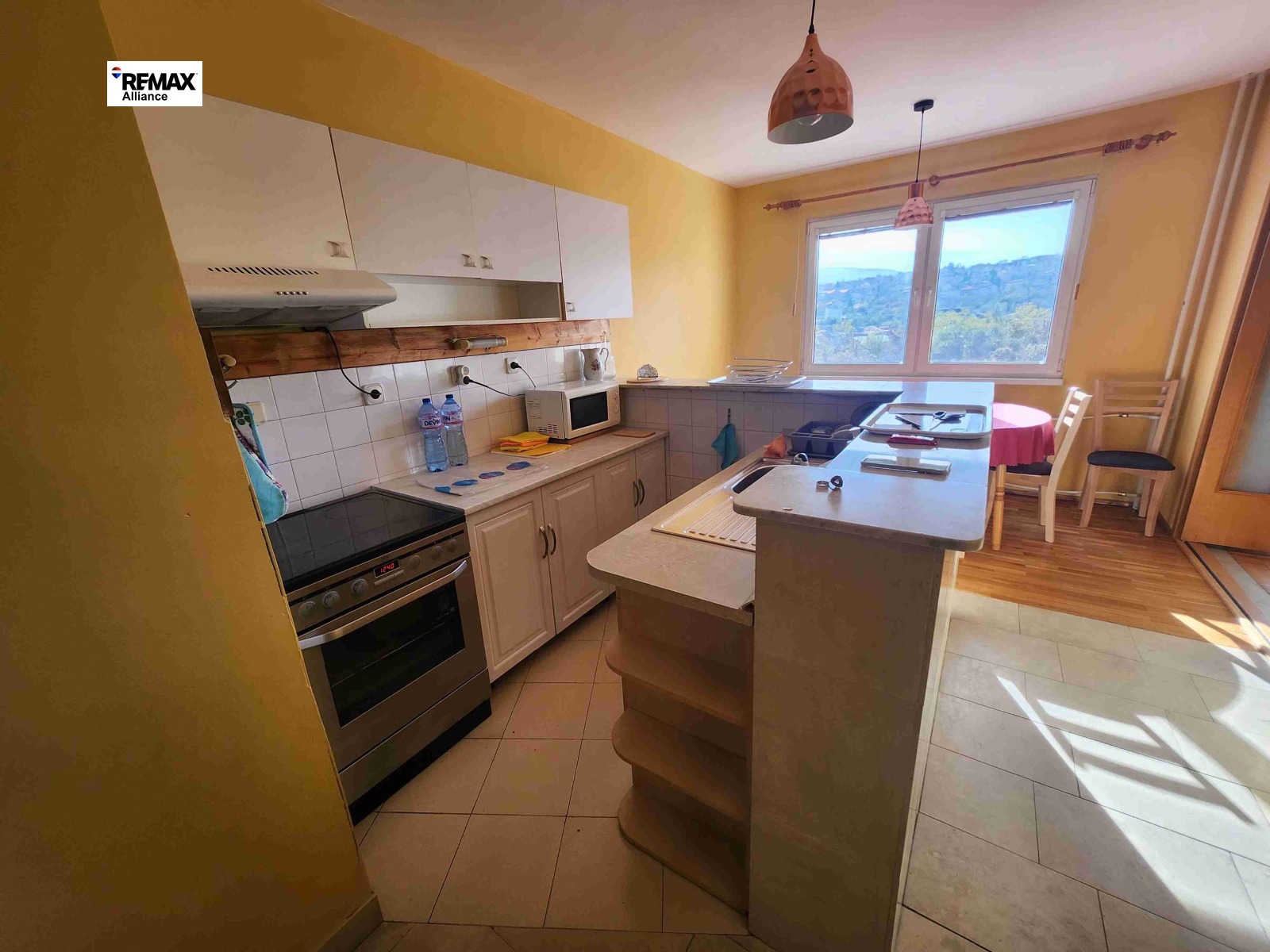 Кухня е напълно оборудвана с всички електроуреди: миялна, печка, абсорбатор, хладилник и микровълнова.